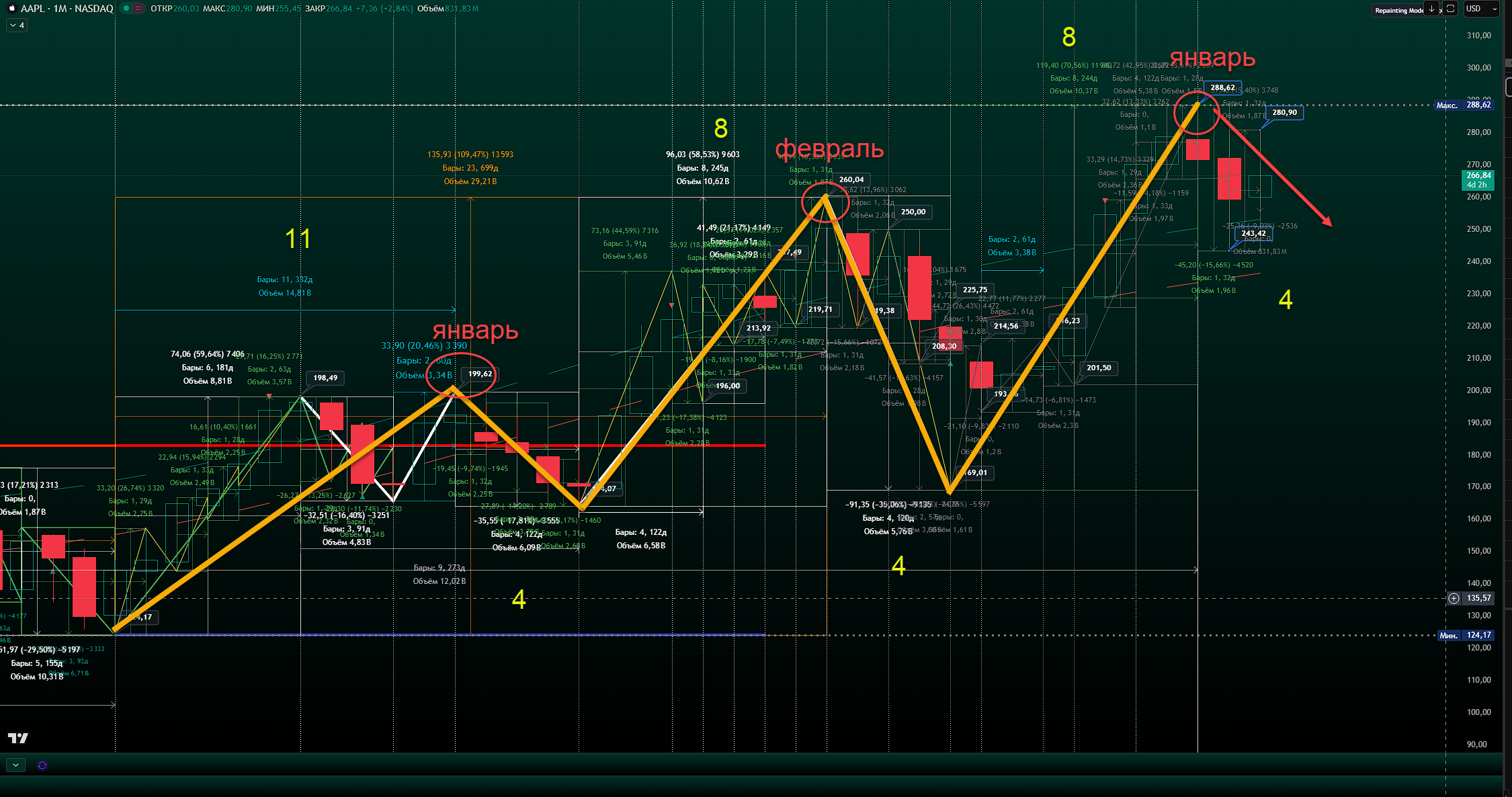 По поводу падения согласен, да и то, только на завтрашний день. И прям завтра 03/03/2025 бы купить считаю. (или 6/03/2025) Цена (если завтра будет обновлен минимум от28/02/2025) на уровне старой вершины 271 от 11/07/2024