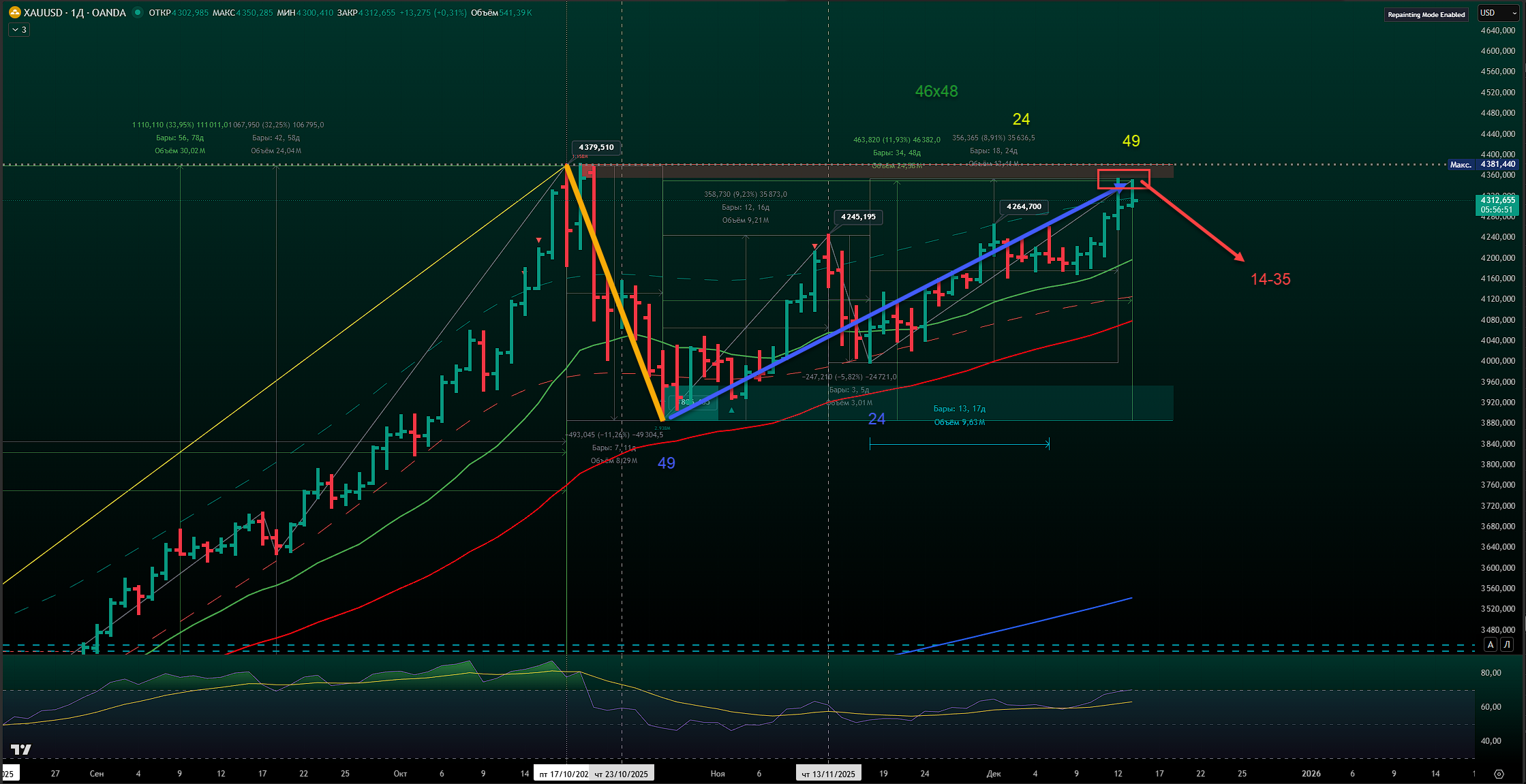 Этот же год соответствует уровню 4500 по золоту, создавая квадратуру между временем (2025) и ценой (4500).